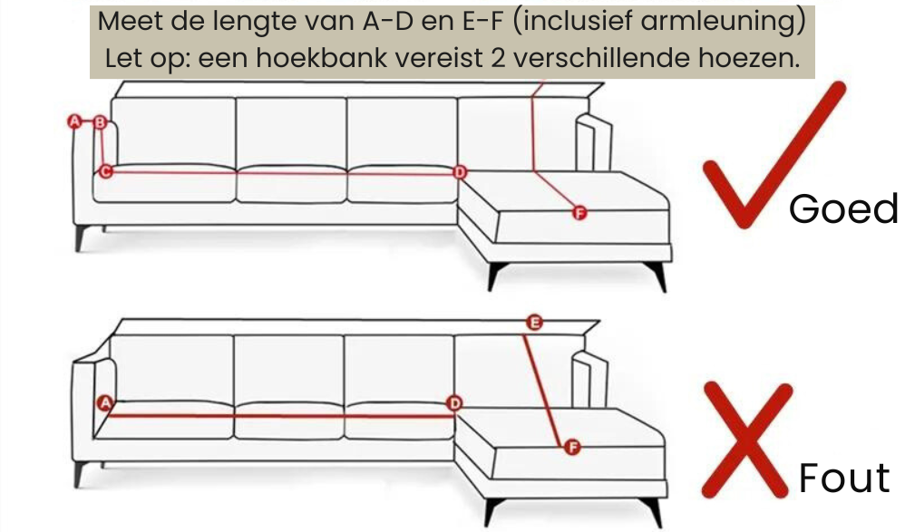 Belangrijk bij een hoekbank is, dat je 2 verschillende hoezen nodig hebt. Één grote hoes past niet over een hoekbank.
