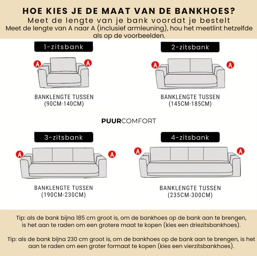 Tip: Wij raden aan wanneer jouw bank gelijk is aan of bijna aan een grotere maat zit. Om 1 maat groter te bestellen. Dit i.v.m. dat de hoezen iets kleiner kunnen uitvallen door gebruik van de verschillende stretch stoffen.